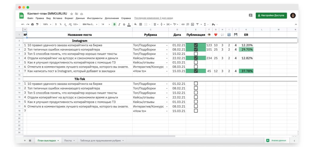 И вернемся к распределению во времени. Я сделал простую таблицу в которой посты идут списком, рядом указана дата выхода и основные показатели, отметка состояния поста (опубликован или нет) и показатель вовлечения. Эту таблицу удобно использовать сразу нескольким людям
