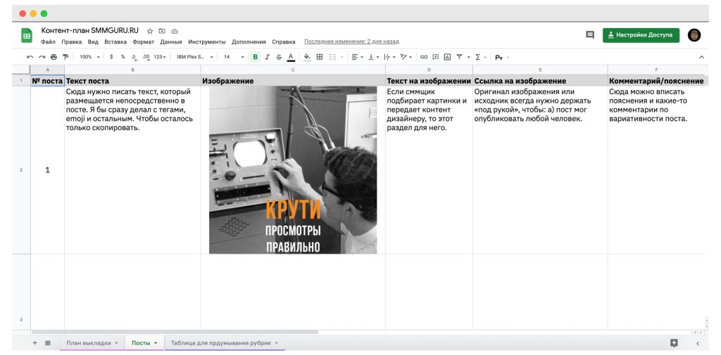 В 80% случаев для любого проекта на 3-5 социальных сетей этого плана (таблицы) достаточно более чем. Более сложная таблица нужна тогда, когда контент в социальных сетях делает несколько человек сразу (есть ответственность разных людей и контент публикуется в разные социальные сети, когда в день выходит по несколько постов сразу. Кстати, Instagram Stories я бы делал отдельной выноской. А вот в отдельной вкладке можно делать сами посты (текст + картинка + комментарий). Опять же, согласовывать посты с заказчиком/клиентом/начальником нужно заранее и сразу на какой-то срок, например, в моей работе чащей всего я согласовываю на 1-2 недели, если частота большая. На месяц, если не очень. Грубо говорят, можно смело вести учет на 10-15.