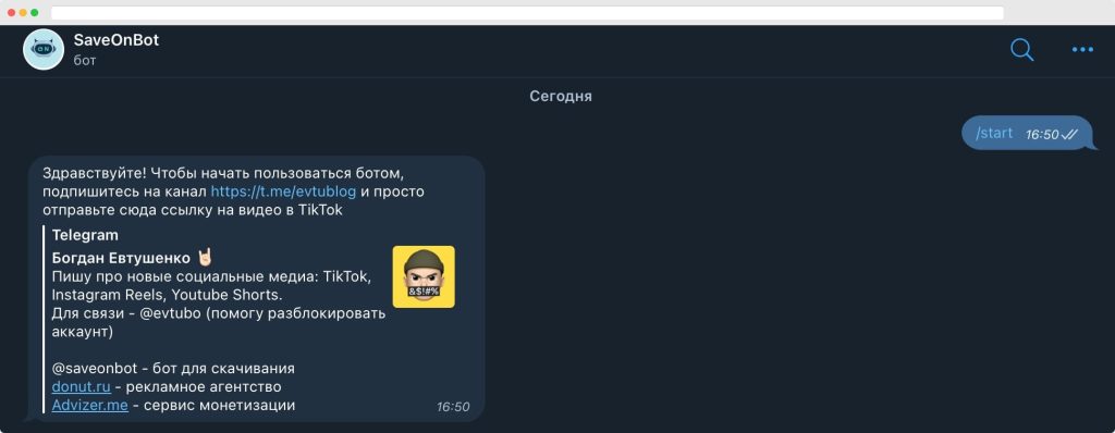 - После прислать в диалог с ним любой вид имеющейся у вас ссылки на видео, ведь бот может считывать короткие ссылки из приложения и длинные с его веб-версии. Спустя несколько секунд, за которые бот обрабатывает видеофайл, готовое видео отправляется в ваш диалог.