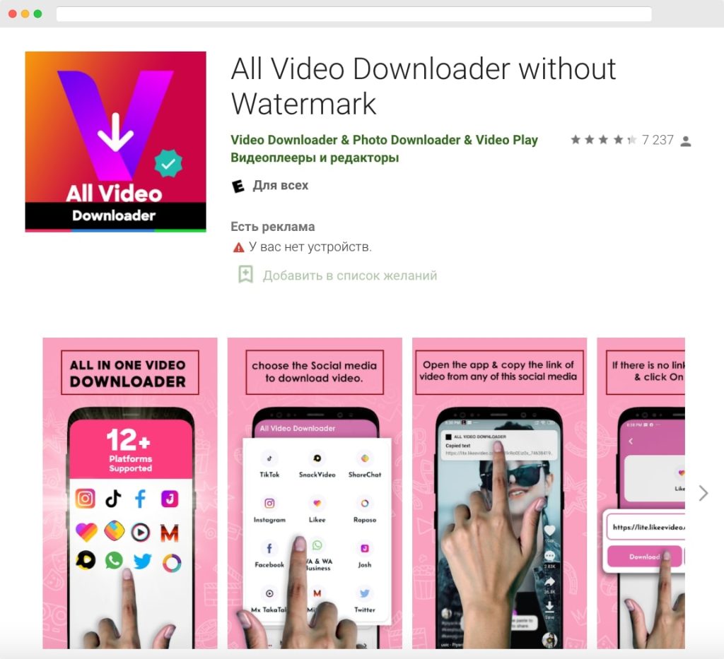 Это приложение используется конкретно для загрузки роликов из Tik-Tok, и оно полностью переведено на русский.