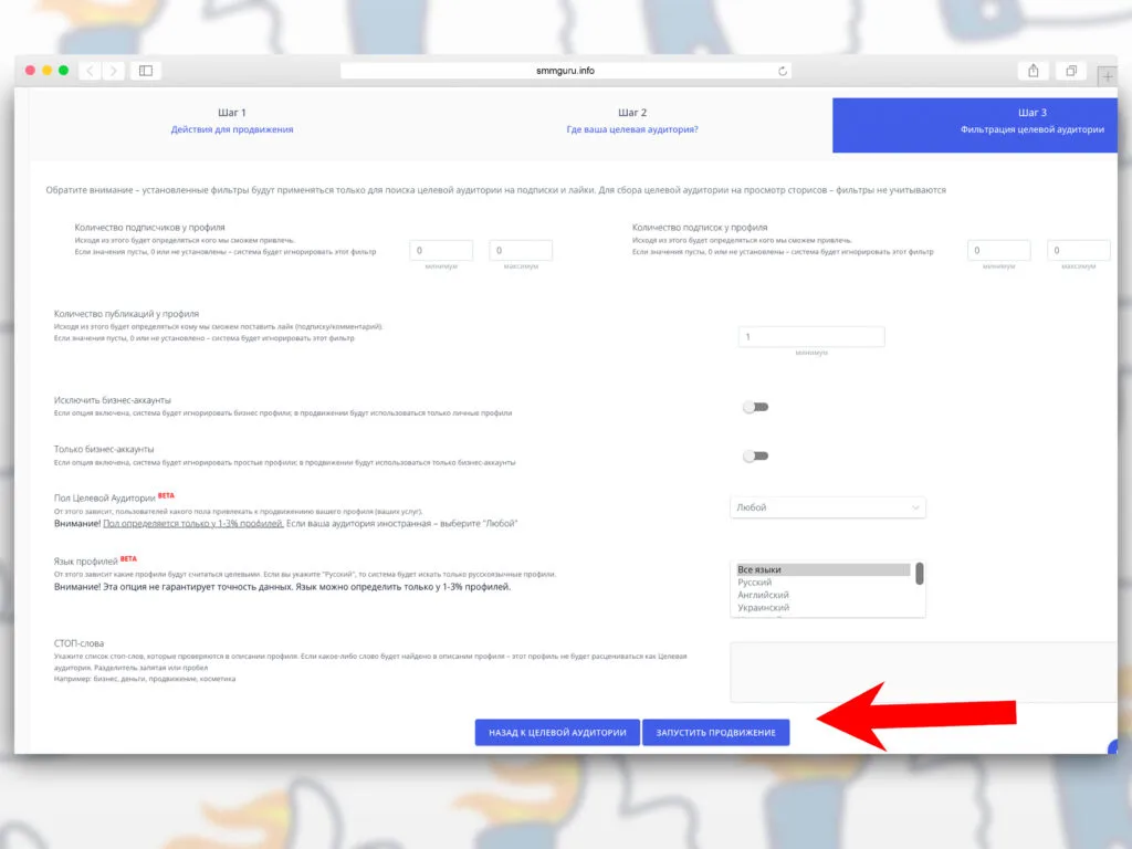 Дальше нужно настроить фильтры по аудитории и если мы говорим о сторис, то тут я не использую настройки вроде количество подписок/подписчиков или количество постов, ведь наличие сторис говорит о том, что профиль с большой долей вероятности вполне активный, поэтому дополнительная фильтрация не нужна. А вот настройка «Язык профиля» полезная, если вы точно уверены, что у ваших пользователей в большинстве своем профиль, например, на русском языке, то выбирайте эту настройку и массовый просмотр историй будет работать именно по таким пользователям. И после нажатия «Запустить продвижение», процесс массового просмотра историй начнется.
