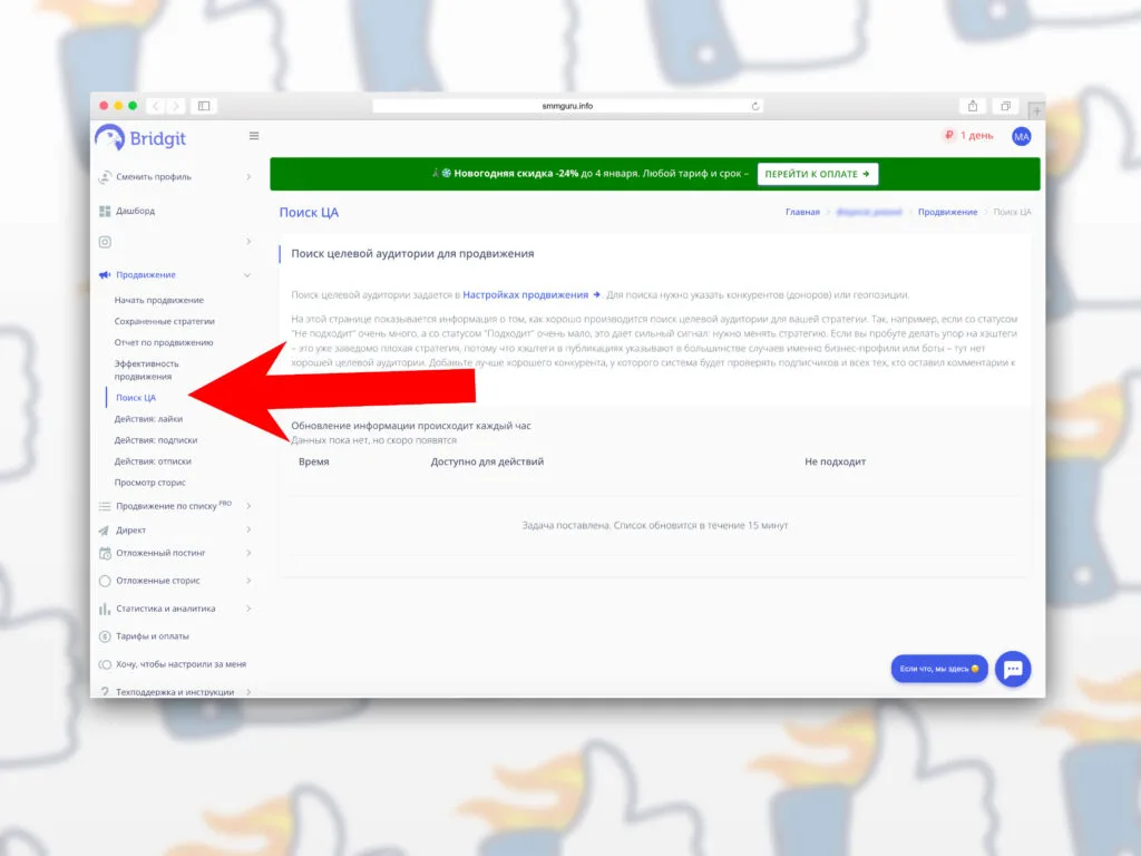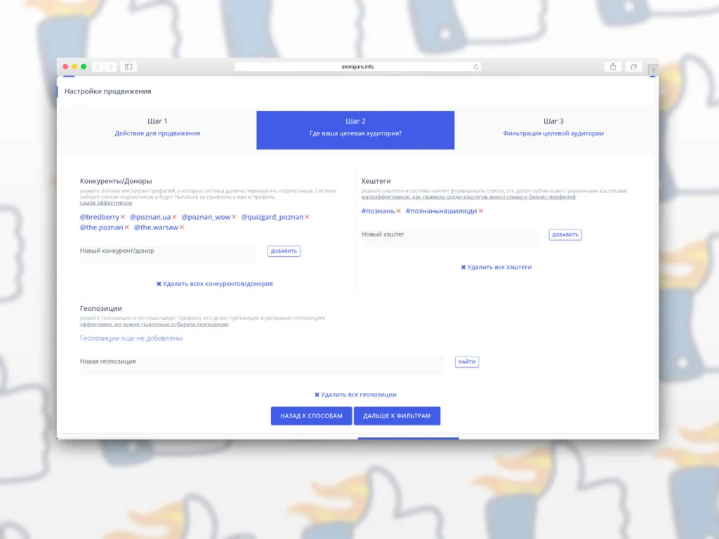В качестве источников целевой аудитории можно указать аккаунт, хештеги и геолокации. Моя рекомендация – не указывайте очень широкие источники аудитории (например, аккаунты с миллионами подписчиков или геопозицию ваш город). Со слишком широкой аудиторией вы просто зря потратите время, так как лимиты не дадут пройтись по всей широкой аудитории, а заинтересовать людей с разными интересами у вас вряд ли получится.