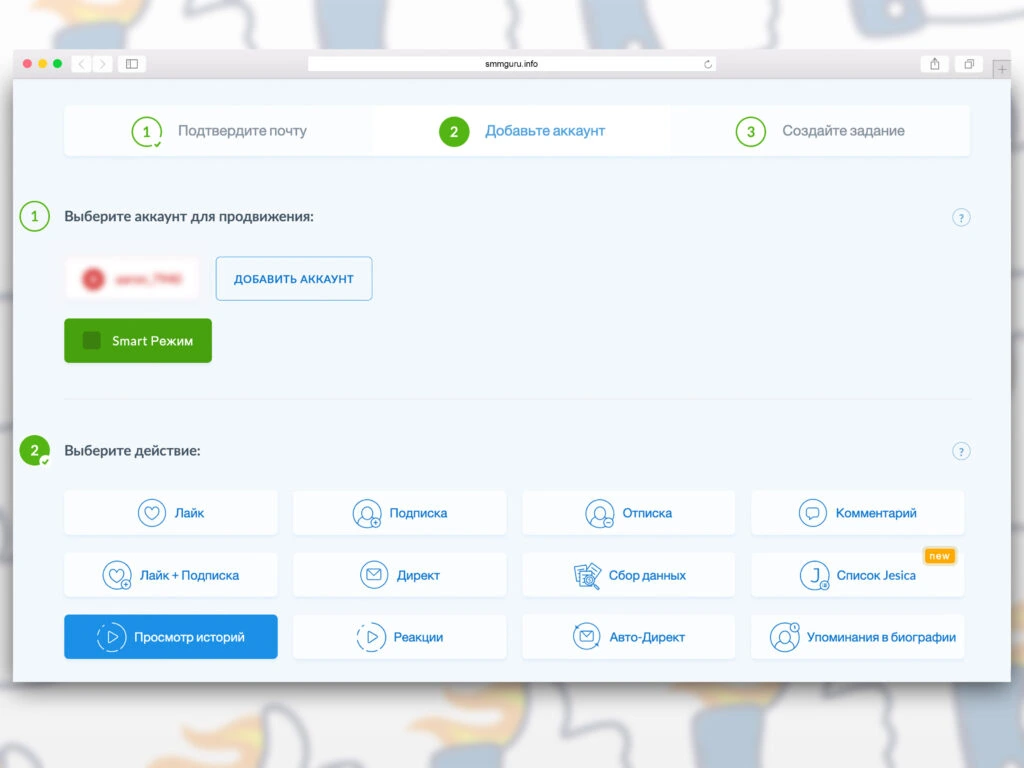 Этот сервис что-то среднее между Instasoft и Bridgit, есть автоматические процесс, где вы доверяете полностью всю работу сервису, есть ручная настройка. Сначала вам нужно добавить аккаунт (как и в Bridgit указать логин и пароль от него). И дальше всё просто, нажимаете «Создать задание», затем выбираете из списка задание, в нашем случае «Просмотр историй» и запускаете продвижение.