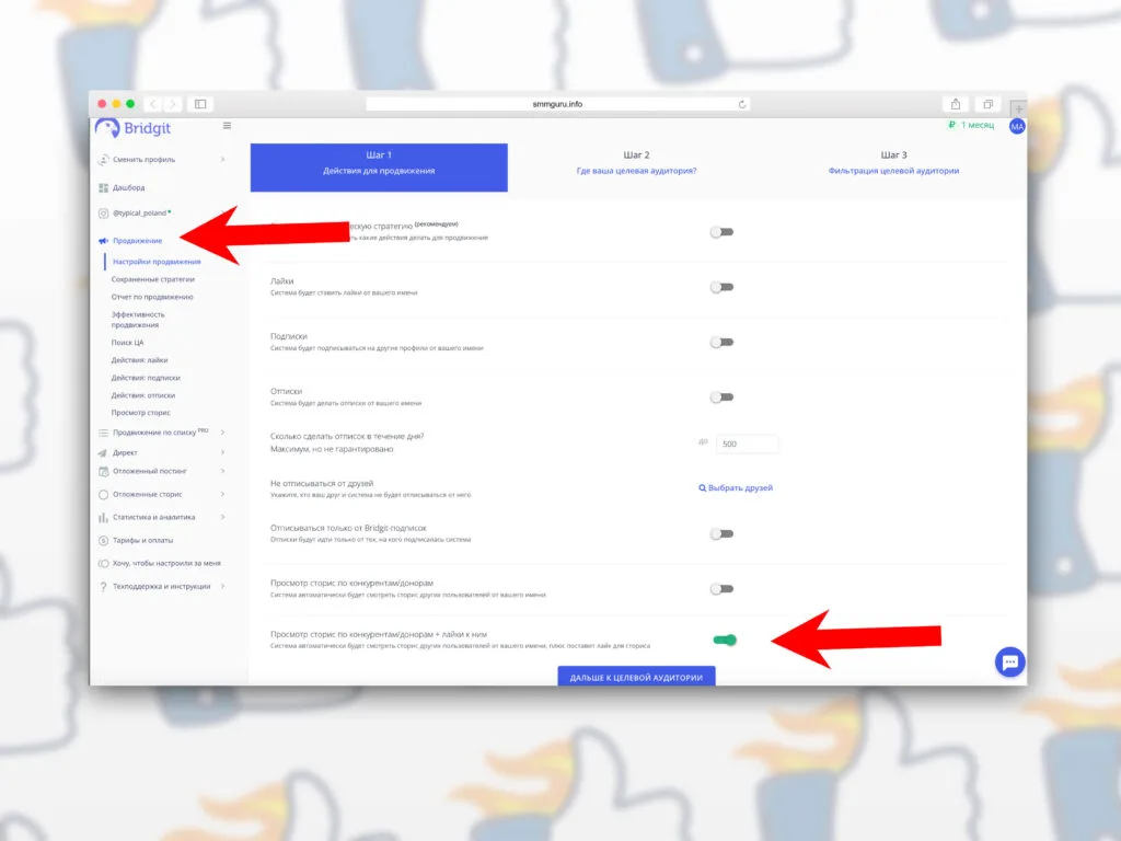 После того, как вы добавите источники аудитории, вам нужно запустить продвижение (масслукинг). Так как у сервиса есть разные способы продвижения, то необходимо зайти во вкладку «Продвижение» затем «Настройки продвижения» и там включите одну из двух опций: просмотр сторис или просмотр сторис + лайк на сторис (рекомендую использовать именно этот вариант).