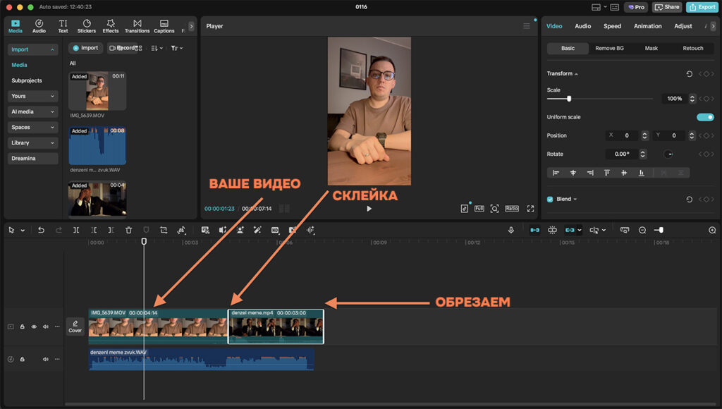 На монтаже в любой монтажной программе вам нужно приклеить снятое ранее вами видео к исходнику мема. Место склейки – тот момент, когда вы ударяете по столу (ладонь непосредственно касается стола), а исходник нужно подогнать, чтобы там также был момент, когда рука непосредственно на столе.