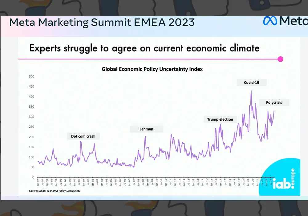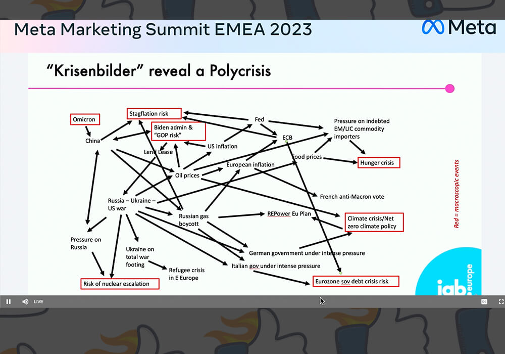 В первую очередь спикеры рассказывали про мировой кризис, который они называются Polycrisis в силу того, что с 2020 года непрерывно происходит череда событий в мире, которая приводит к уменьшению покупательской способности (дальше они сделают на покупательской способности людей акцент, так как это является определенным драйвером активности рекламодателей). Забавно, что в один список с другими кризисами добавлен президентский срок Трампа.