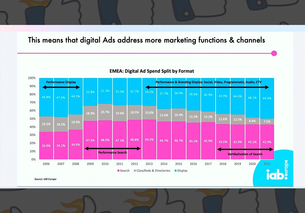 Но даже внутри типов диджитал каналов есть свои тренды, например уверенный рост доли Performance и Display каналов. Классифайды и директории, как видно на графике, постепенно умирают. Мое мнение, что они останутся только в узких и B2B нишах.