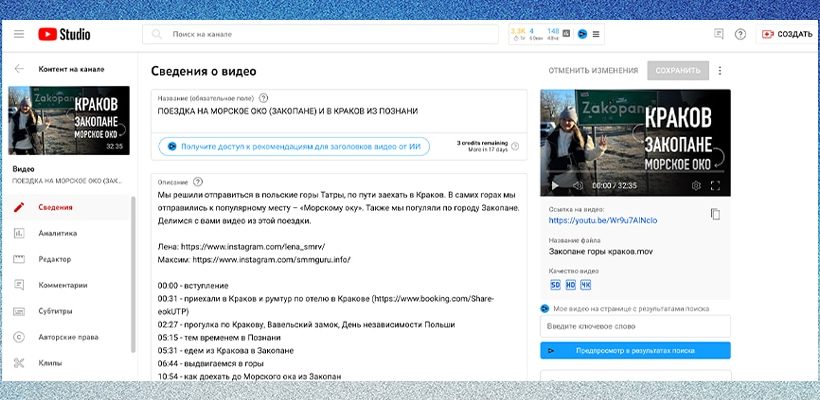 И тут нужно быть виртуозом слова, так как вам нужно постараться придумать такое название, которое будет привлекать (в идеале содержать интригу, чтобы пользователю хотелось на название кликнуть), да еще и содержало ключевые слова. Как на примере выше, можно было написать «Познань минусы | переезд в Познань | Познань плюсы минусы» и этот вариант работал бы, видео получило бы какие-нибудь просмотры. Но заголовок «ЕЛЕ НАШЛИ МИНУСЫ ЖИЗНИ В ПОЗНАНИ» вызывает желание нажать и посмотреть, что же там такое. А дальше, чтобы добрать знаки, можно уже добавить и несколько ключевых фраз. Видео, кстати, получило почти 7 000 просмотров на момент написания поста.