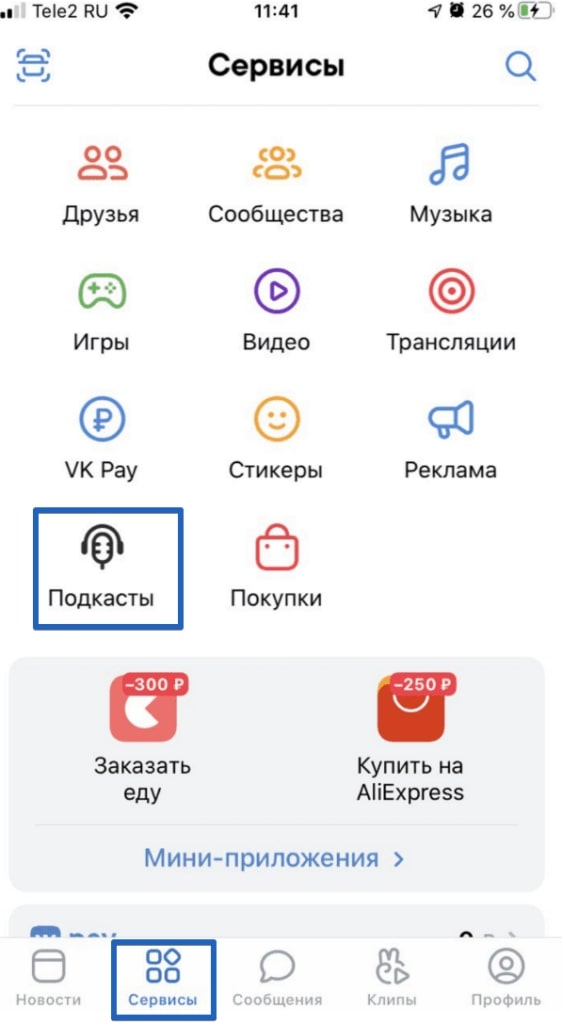 Разработчики еще не создали перечень категорий на веб-сайте ВКонтакте, но он есть в приложении. Для поиска тематических звукозаписей на смартфоне (пример на IOS устройстве), нажмите на раздел сервисы, затем выберите «Подкасты», спуститесь ниже по экрану и выбирайте то, что вам понравится (или задействуйте поиск).