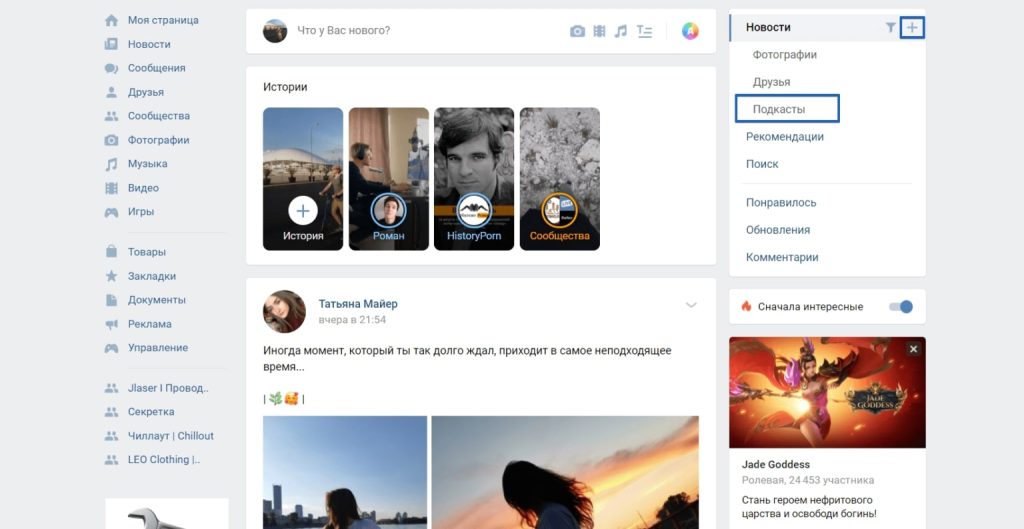 Чтобы подписаться на конкретный паблик, который практикуется исключительно на этом формате, перейдите в раздел Новости → Подраздел Подкасты. В ленте увидите список аудиофайлов.