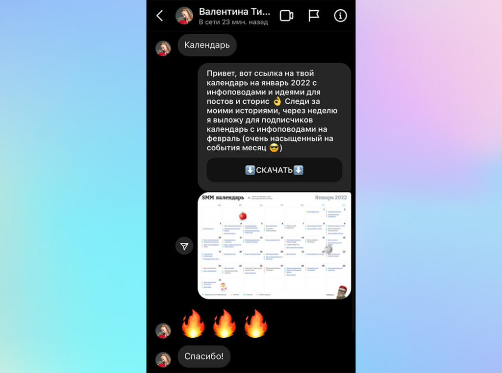 А мы двигаемся дальше. Подумав, я решил, что добавлю в автоответ еще «крючок», чтобы была мотивация оставаться подписанным на меня: я пообещал в сториз выложить календарь на февраль (а потом на март, апрель, май и так до конца года ?). Итоговое сообщение со ссылкой после пары вариантов стало выглядеть вот так: