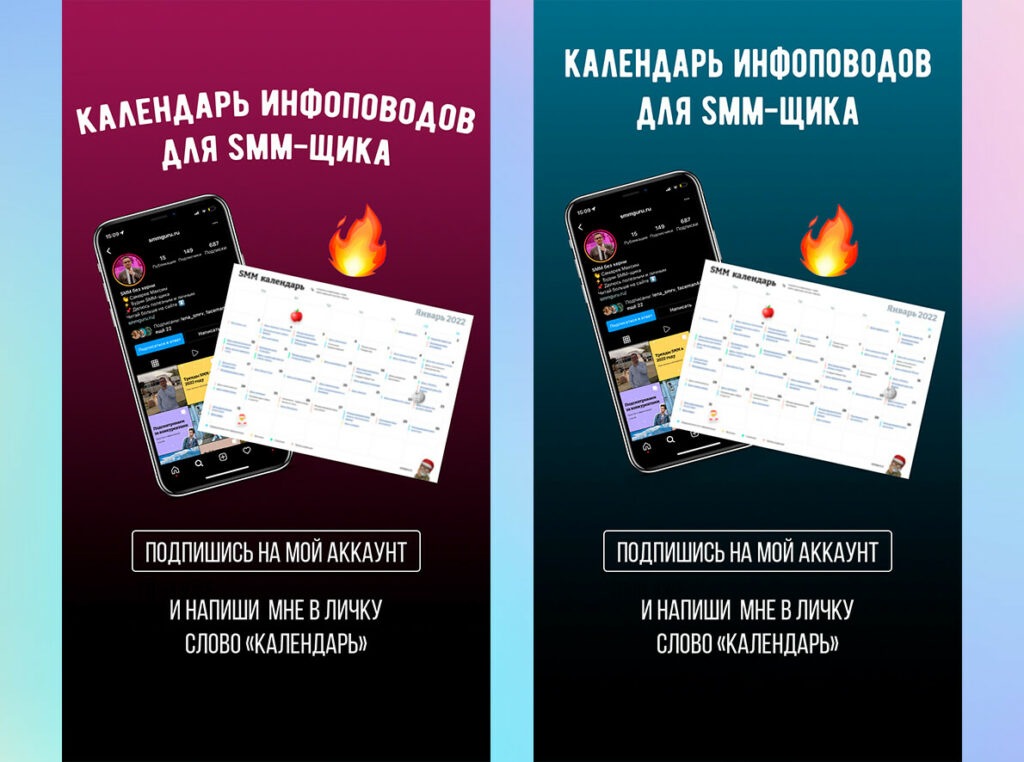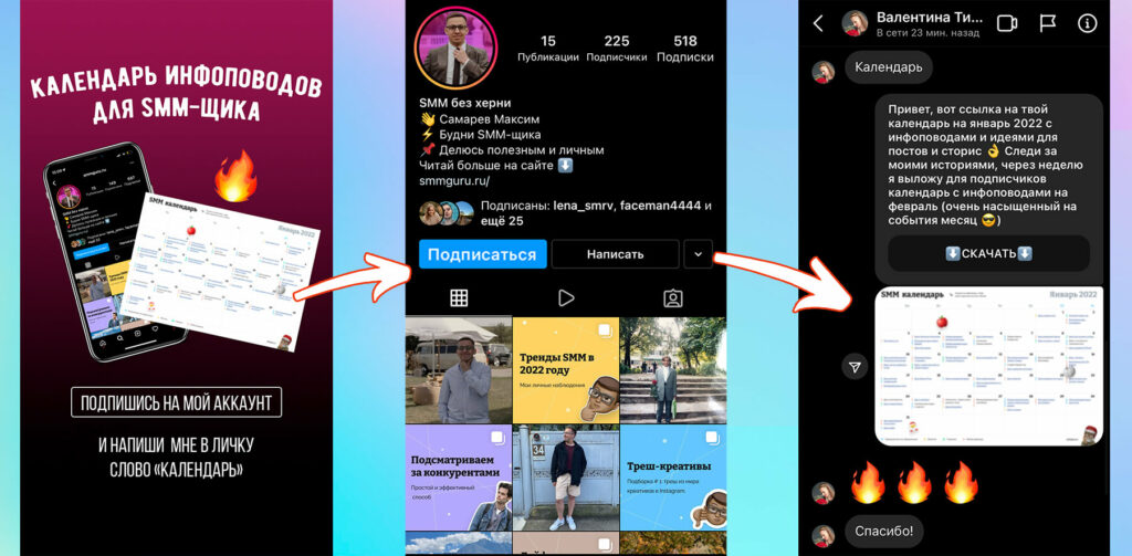 Вроде всё просто, но это на первый взгляд. Дальше начинается придумывание того, что вы можете дать полезного в своей сфере. И тут первые сложности, так как что-то полезное трудно придумать, а еще труднее сделать. Именно поэтому Instagram заполонили говно чек-листы. Не так-то легко сделать что-то стоящее. В моем случае я сделал pdf-календарь с инфоповодами и версию за январь я дарил за подписку.