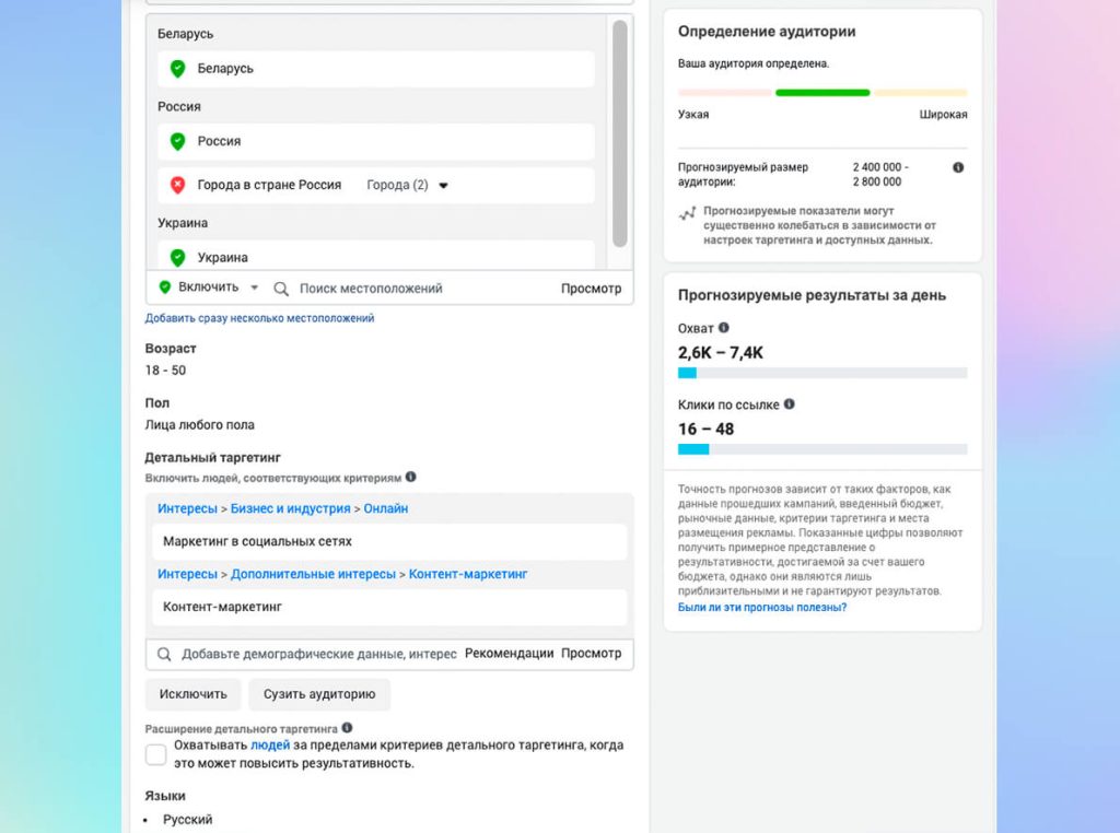 Я настроил таргет на людей 18–50 лет, из России, Украины, Беларуси с интересами «Маркетинг в социальных сетях» и «Контент-маркетинг», в России я исключил из показов Москву и Санкт-Петербург (на эти города нужен бюджет побольше, мой тестовый бюджет просто размоет быстро).
