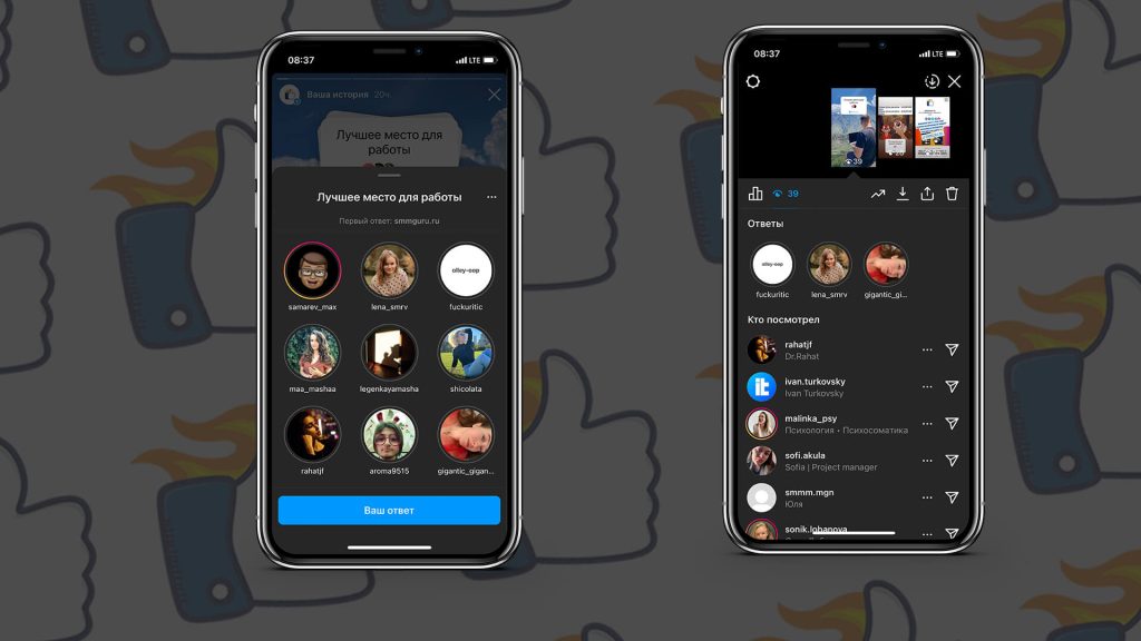 Слева показано то, как видите вы и другие список тех, кто ответил. Там будут показаны все, у кого открыт профиль для наблюдателя. А справа показано то, как вы видите ответивших среди своих подписчиков, при просмотре статистики истории.