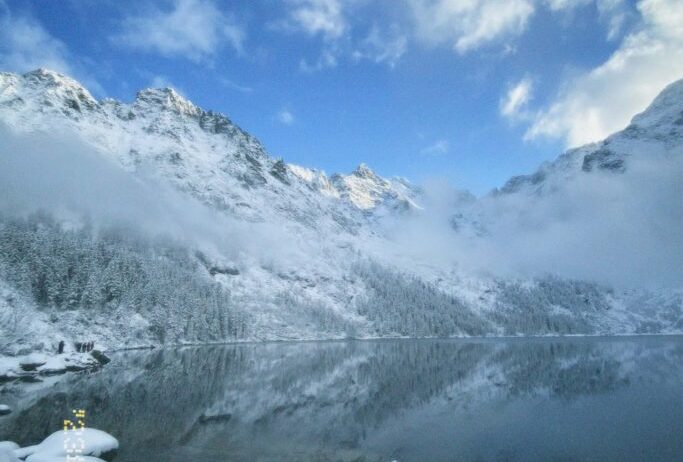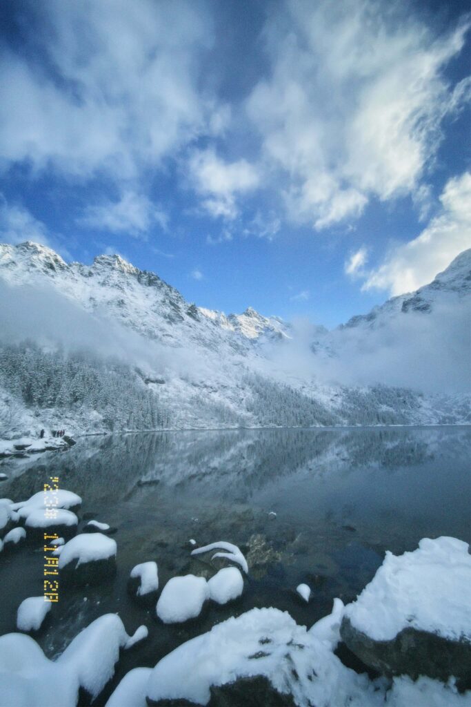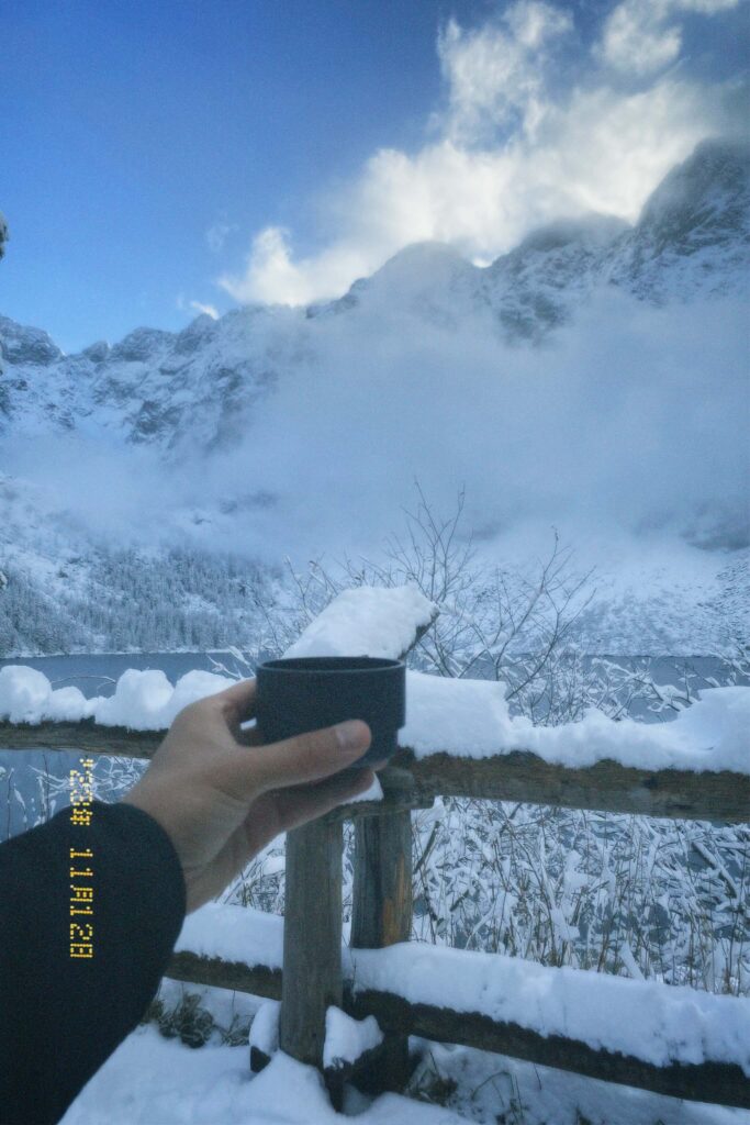 Мы периодически останавливались, чтобы полюбоваться красотами вокруг, пофотографироваться и попить кофе из термоса. И даже с учетом этого, наш путь к озеру занял 2 часа. На самом озере людей было не так уж и много, но чтобы прямо к воде спуститься и сделать пару фото, нужно было, держась за канат, спуститься по длиной обледенелой лестнице (но опять же, оно того стоит). Озеро выглядит очень красиво в яркую солнечную погоду, так видно вокруг все горы. Поэтому рекомендую посмотреть прогноз заранее, будучи еще в Закопанах.
